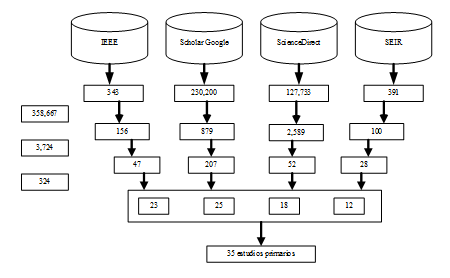 Después de realizar la estrategia de búsqueda, como muestra la Figura 1, de 358.667 estudios encontrados, después de aplicar los criterios de selección se identificaron 35 estudios como estudios primarios, que son los estudios que cumplen los criterios. Los cuales fueron analizados y utilizados para establecer los resultados de este trabajo de investigación. El apéndice A presenta una lista de los estudios.
