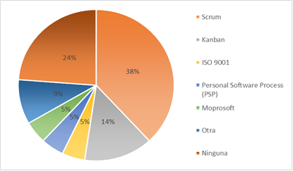 De acuerdo a los resultados de la encuesta, las metodologías y/o modelos que se manejan para asegurar la calidad del software en las pymes de desarrollo de software, el 38% de las pymes utilizan scrum, el 14% que utilizan kanban, y el 24% ninguna, El resto de los porcentajes de las empresas se muestran en la Figura 2.
