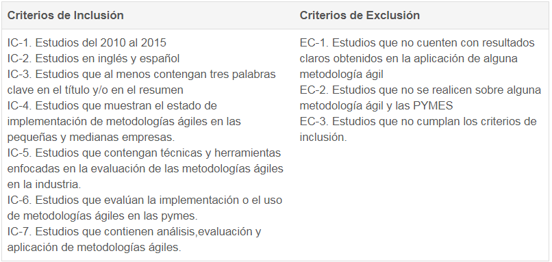 Los criterios de selección son las reglas que se definen como parte de la revisión sistemática y que apoyan garantizando que de los estudios obtenidos sólo se consideren aquellos contienen información pertinente relativa a la a las preguntas de investigación que dirigen la investigación que se está llevando a cabo.