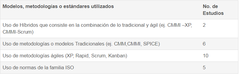 En esta sección se muestran los resultados con respecto a los 35 estudios primarios seleccionados, sólo 23 hacen referencias a modelos, métodos y normas utilizados como a continuación se indica en la Tabla 2.