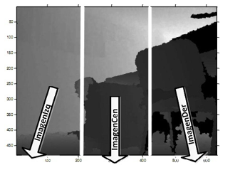 Un método usado para el tratamiento de la imagen de profundidad es dividir esta en sub-imágenes (Csaba y Vámossy, 2012; Csaba, 2013). En el sistema propuesto la imagen es divida en tres secciones de 211x480 pixeles, las cuales representan las direcciones posibles en las que la plataforma móvil puede moverse: girar a la derecha, seguir de frente y girar a la izquierda (véase Figura 3).