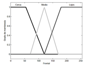 Para cada una de las variables de entrada Izquierda, Frontal y Derecha se definen 3 valores lingüísticos: Cerca representando las profundidades de los “objetos cercanos”, Medio considerando la profundidad de aquellos objetos que no están “ni muy lejos ni muy cerca”, y Lejos para indicar las profundidades de los “objetos alejados” del Kinect. Se hacen uso de funciones de membresía trapezoidales para los valores lingüísticos Cerca y Lejos, y triangular para Medio (véase Figura 4). Este tipo de funciones de membresía no representan operaciones complejas como es el caso de la función gaussiana o la campana generalizada (Jang et al., 1997).