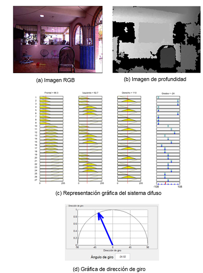 En la Figura 5 se ilustra el comportamiento del sistema dentro de un ambiente doméstico sin movimiento de los objetos e iluminación natural moderada. En las Figuras 5a y 5b se presentan la imagen RGB y su correspondiente imagen de profundidad. En la Figura 5c se muestra una representación del sistema difuso, el cual identifica las profundidades en cada lado de la imagen otorgándoles valores lingüísticos usando las reglas difusas, para finalmente a través del método de inferencia genere el ángulo de giro en grados (véase Figura 5d). Se observó que el sistema trata de seguir el espacio con la menor probabilidad de colisión manteniéndose estable al continuar en espacios con información conocida. Dependiendo de la cantidad de datos desconocidos, el sistema infiere si debe ignorarlos o considerarlos dentro del cálculo de la profundidad promedio por cada sub-imagen. En el ejemplo de la Figura 5, los datos de profundidad desconocidos son ignorados al no abarcar un área mayor a dos terceras partes de la imagen total.
