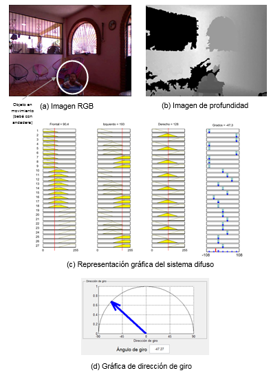 En la Figura 6 se muestra un caso donde las profundidades van desde los rangos cercanos a los lejanos en un ambiente en donde un objeto se va acercando poco a poco al sensor (leves movimientos). En la Figura 6a se presenta la imagen RGB. En la Figura 6b se muestra la imagen de profundidad, en donde se observa cómo algunos elementos toman valores desconocidos. El sensor adquiere la imagen de profundidad para que así el sistema procese la información y reaccione para evadir al objeto en movimiento (bebé en andadera en la Figura 6a). Es de notar que las partes desconocidas no son consideradas por el sistema, ya que a pesar de abarcar un área casi uniforme, no representan un objeto. El sistema define un giro hacia la izquierda de −47.3º (véase Figura 6c) al observar una profundidad promedio mayor (193) en la parte izquierda (véase Figura 6d).