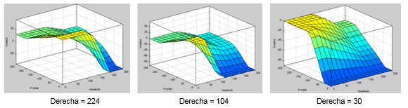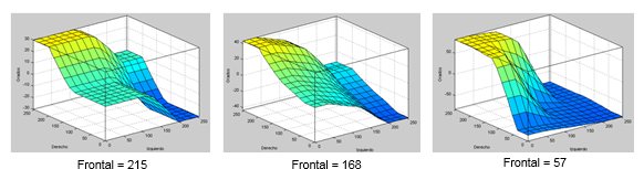 El comportamiento de cada variable en función de los datos de profundidad puede ser visualizado en un gráfico 3D. Donde el eje z es el ángulo de giro de la plataforma móvil, el eje x y y son los valores de profundidad promedio acorde a dos variables de entrada. De esta forma es posible examinar el comportamiento de la variable de salida (ángulo de giro) utilizando combinaciones entre dos entradas que varían como producto de cambios en el entorno (obstáculos o ruido) y una entrada constante, generando los siguientes escenarios: