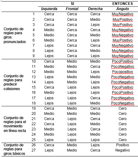 Dependiendo del número de permutaciones de los valores lingüísticos (Cerca, Medio y Lejos) con respecto a las variables de entrada (Izquierda, Frontal y Derecha), se desarrolla un conjunto de reglas difusas para obtener el valor de salida que corresponde al giro de la plataforma móvil. El control difuso emplea 27 reglas divididas en cuatro grupos dependiendo de un objetivo en común: reglas para la ejecución de giros pronunciados, reglas para la predicción de colisiones, reglas para el movimiento en línea recta, y reglas para giros básicos. En la Tabla 1 se muestran las reglas difusas planteadas. Las reglas buscan emular la reacción humana durante la navegación, ya que generan reacciones graduales que van desde prácticamente no ejecutar giro hasta los movimientos bruscos ante colisiones imprevistas o en movimiento. El conjunto de reglas tiene como principal objetivo producir giros suaves que permitan asegurar la integridad de la plataforma móvil.