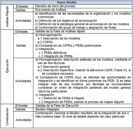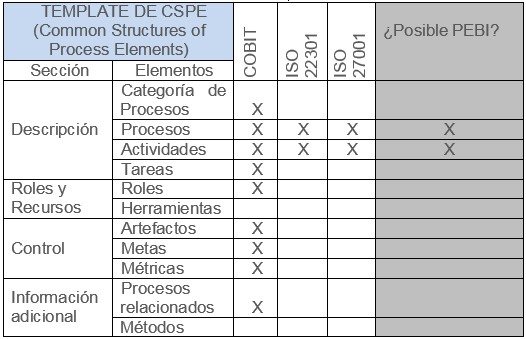 La homogeneización, que pone en armonía los modelos involucrados, visualizando la información por medio de CSPEs (Common Structures of Process Elements) (Pardo, Pino, García, & Piattini, 2009), con elementos optativos, de acuerdo a los contenidos de los MRMP (Ver la Tabla II).Los CSPEs permiten también identificar los elementos posibles a integrarse o PEBI (Process Elements to Be Integrated), cuya decisión depende de los modelos base. Por ejemplo, para COBIT, ISO 22301 e ISO 27001 se identifican a los procesos y actividades como los PEBIs comunes.