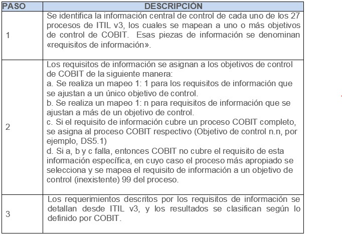 ISACA (ISACA, 2011) e ITG (ITG, 2008) han publicado los resultados de mapeos entre COBIT 4.1 y guías de referencia que se pueden utilizar para mejorar la definición de los objetivos de control de COBIT 4.1 y la alineación con otras buenas prácticas y estándares. Se afirma que los resultados ayudan a las organizaciones que planean aplicar normas y guías, a armonizar iniciativas y a utilizar COBIT 4.1 como marco general para la gobernanza de TI. Este alineamiento se inicia con un esquema descriptivo de cada una de las guías o normas a alinearse. El procedimiento continúa mediante tres pasos que se resumen en la Tabla I, para el caso de alineamiento de COBIT 4.1 con ITIL v3. Se obtiene un resultado desde la perspectiva de ITIL hacia COBIT (ITG, 2008).