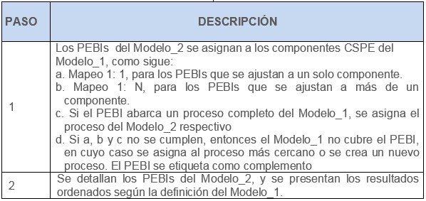 Comparación. Se identifican los elementos con posibilidades de integración, que pasan a constituir los PEBIs preliminares. El orden de integración a usar es el siguiente: los PEBIs candidatos a integrarse deberán identificarse en ISO 22301 (Modelo_2) e integrarse con los PEBIs del proceso COBIT 5 (Modelo_1). En la integración de ISO 22301 e ISO 27001, el Modelo_1 es ISO 22301 y el Modelo_2 es ISO 27001. Para este caso, se requiere la comparación de COBIT e ISO 27001, por lo que los PEBIs candidatos deberán identificarse en ISO 27001 (Modelo_2) e integrarse a los PEBIs del proceso COBIT 5 (Modelo_1).