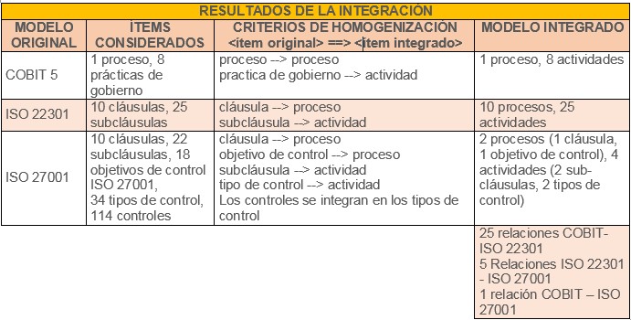 Estos resultados corroboran la adecuación del orden de inclusión de los modelos en la estrategia de integración, puesto que se facilitó el trabajo de mapeo; así, existe una sola relación directa COBIT 5 ISO 27001. En la Tabla VI se presenta un resumen de los resultados de integración; estos muestran los criterios de homogenización entre los modelos involucrados, a un nivel de procesos, cláusulas, subcláusulas, objetivos de control y tipos de control.