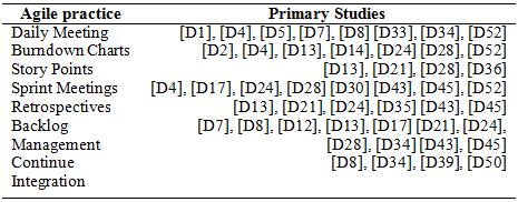 Finally, from the analysis of 52 studies, we could find that the agile practices applicability is defined by the organization’s needs, when the needs are defined correctly and agile principles are considered, there are no restrictions on the use and adaptation of certain agile practices unless the application of some of them are conditioned by the project or organization context. Next, in Table 7, there are all agile practices which are mentioned or referred in the primary studies.