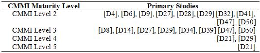 On the other hand, we can see that the adoption of agile practices in organizations with the CMMI approach is not influenced by the CMMI maturity level of the companies. In fact, the studies [D4], [D6], [D28], [D29], [D30], [D37], [D41] and [D43] shows scenarios where the organizations have or try to get levels 2 and 3 from CMMI; whereas in studies [D7], [D12], [D14], [D21] and [D24] there are references to higher maturity levels such as 4 and 5. This indicates that there is an interest in agile practices regardless the maturity level of the organizations. Also, it is important to point that the organizations with CMMI culture looks to continue to improve not only by using one single agile methodology; in fact, the adoption of agile practices can be done by using a mix of agile approaches in order to get the best of these practices. The studies [D14], [D24], [D34], [D20], [D39], [D43] and [D51] show the multiple agile practices that were used in contexts of CMMI organizations.