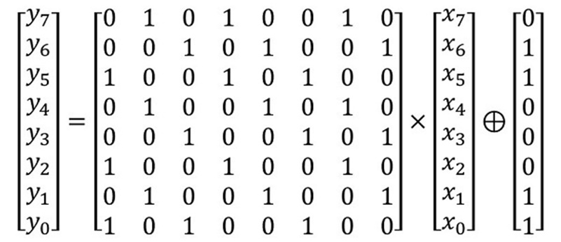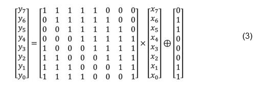 The matrix representation of the transformation is shown in (3), where M is replaced by the constant matrix of 8×8 bits, x is expanded to the polynomial representation of a byte, starting with the most significant bit; and b the binary constant.