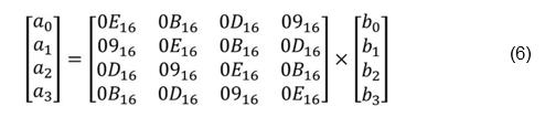 The MixColumns step is a bricklayer permutation operating on the state column by column. In Mixcolumns the state columns are considered as polynomials in GF (28) and multiplied modulo x4 + 1 with the fixed polynomial c(x) given by c(x) = (0316 )x3 + (0116)x2 + (0116)x + 0216 . This operation can be written as a matrix multiplication, let b(x) = c(x) a(x) mod x4 +1 as is show in (5)