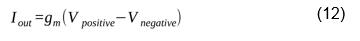 where gm is the transconductance gain, Vin1 the positive input voltage, Vin2 the negative input voltage and Iout the output current.