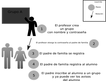 Para el desarrollo de las actividades ilustradas en la Tabla II, también se tuvo que analizar como sería el flujo de inscripción de los padres de familia, así como la de los profesores. Usando como base el modelo de inscripción de Edmodo, la aplicación web también necesita primero que un profesor se inscriba en la aplicación web, el siguiente paso es que el profesor cree un grupo que es el nexo lógico que une a los estudiantes, tareas y el profesor; gracias al grupo se puede “agrupar” esa información logrando que los maestros como padres de familia no estén expuesto a información que no les sea relevante.