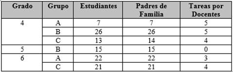 Cumpliendo con el principal objetivo, que es la elaboración de un prototipo de aplicación web, que permita a profesores de escuelas primarias notificar a un grupo de padres de familia sobre las tareas de un alumno. En la fase de prueba se contó con la participación de ciento cinco padres de familia y seis docentes, los cuales se describen en la Tabla III. El uso se realizó en el último bloque de los cinco bloques del los cuales se encuentran integrados los cursos de primaria.
