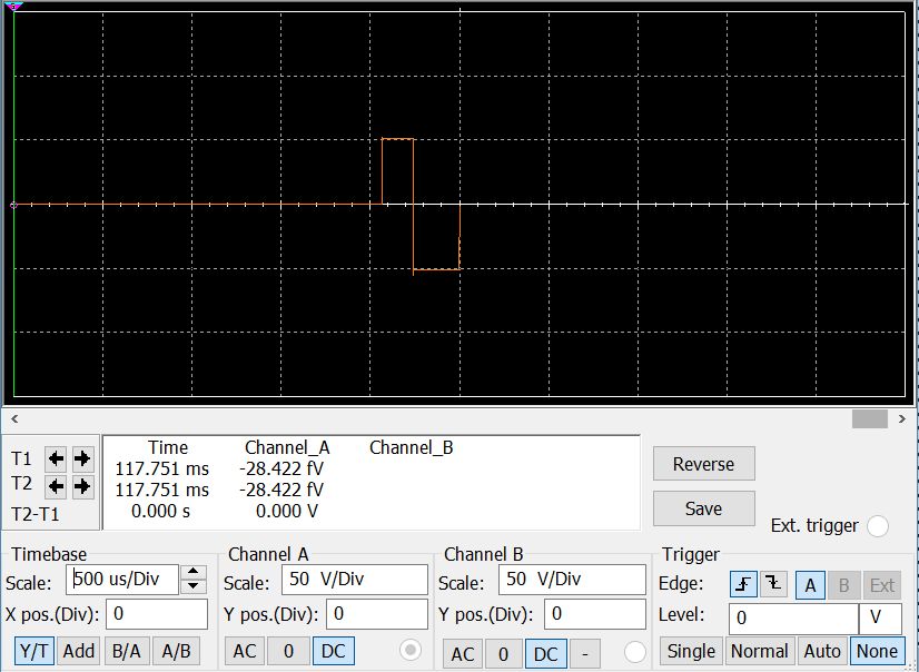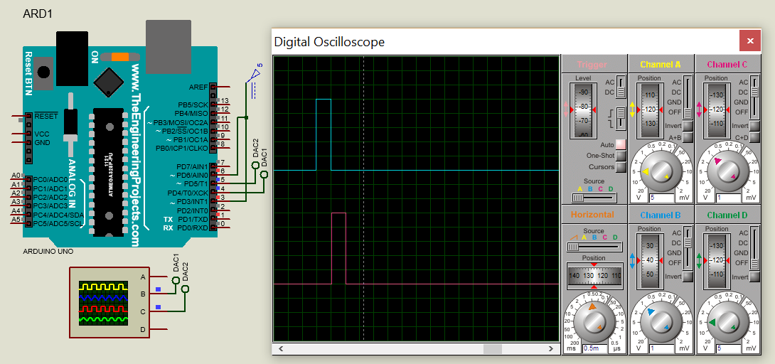 La simulación se llevó a cabo utilizando Proteus Design Suite® y NI Multisim® Ver 14.0. Proteus se usó para simular y mejorar el firmware en Arduino y para verificar si los pulsos se producían correctamente. La Figura 4 muestra la simulación de impulsos de 500 μs de ancho y 50 Hz generados por el programa hecho en Arduino.