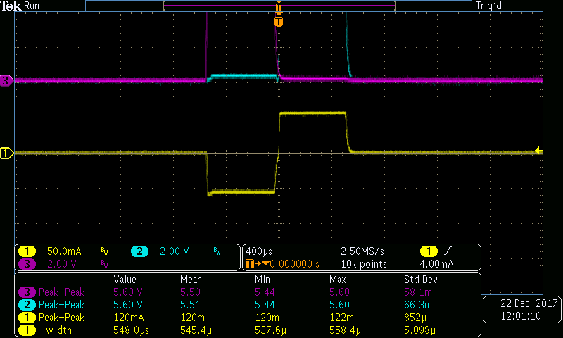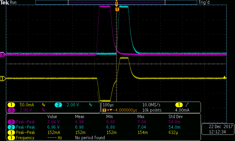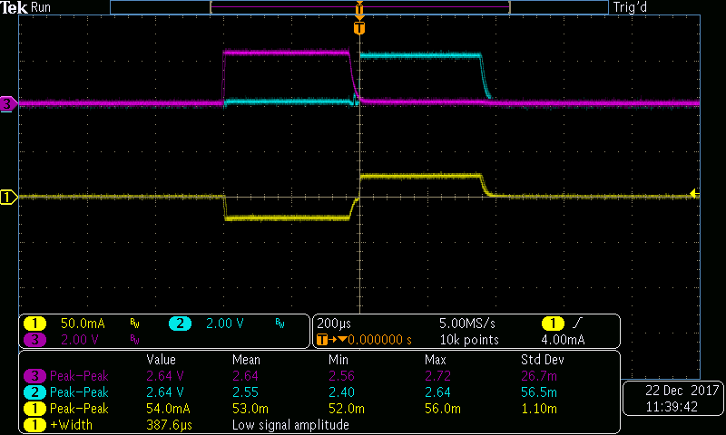 En la Tabla 1 se muestran los valores de la corriente medidos en la resistencia de carga del circuito en la Figura 5. La Figura 7 representa la tendencia de la magnitud de corriente alcanzada en relación con el control de voltaje variable diseñado. Se puede observar que el circuito diseñado responde linealmente con la entrada. En la Figura 8 se muestra un ejemplo de pulso bifásico generado en la resistencia de carga. Se puede observar que el circuito propuesto es capaz de controlar la magnitud del pulso, así como también, el ancho del pulso dependiendo del valor de voltaje que se encuentra en las señales de control DAC1 o DAC2. En la Figura 9, la Figura 10 y la Figura 11 se muestra el rango de trabajo del circuito propuesto en base a las características de diseño, el sistema se simuló de 1 a 150 Hz y de 50 a 500 μs de ancho con un buen rendimiento, los pulsos en color violeta y azul representan las señales de entrada (DAC1 y DAC2) respectivamente, cada uno de ellos mostrados en un rango de voltaje de 0 a 10 V.