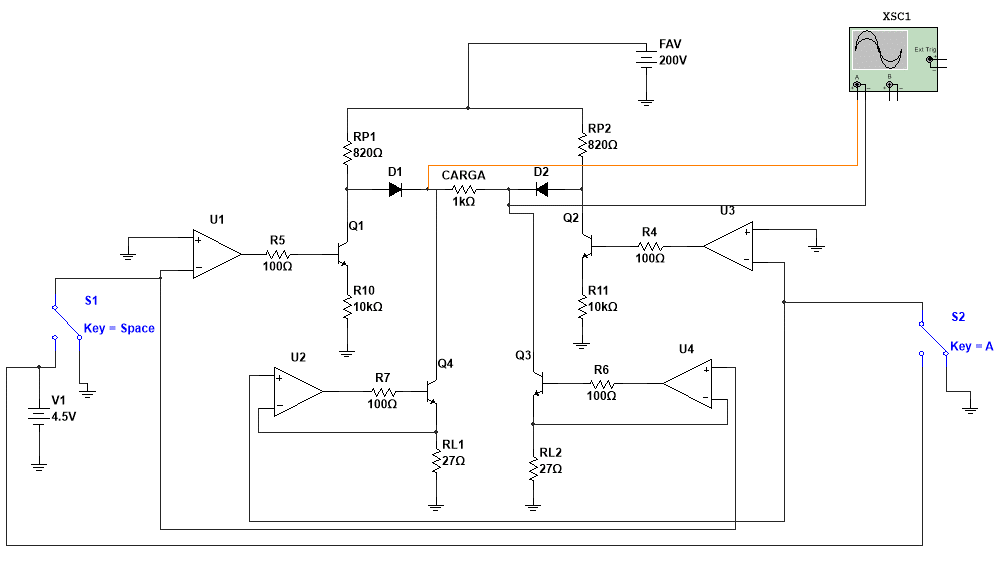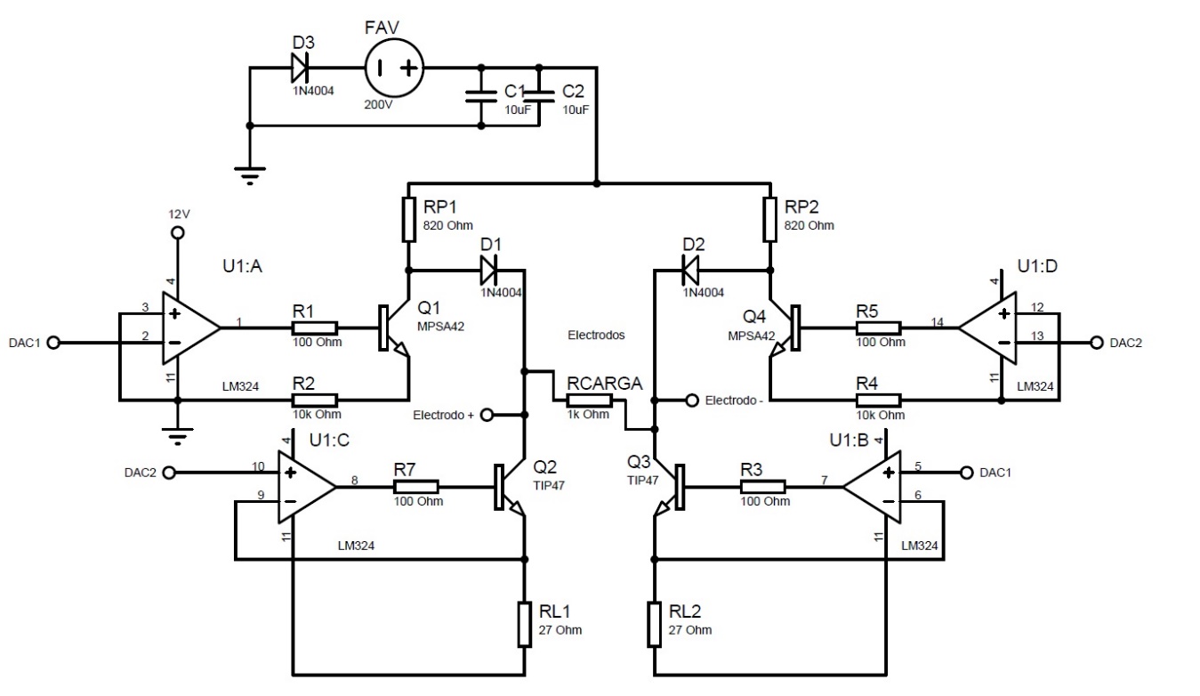 Por otro lado A medida que aumenta la corriente, la caída de voltaje en la resistencia RL1 o RL2 aumentará, haciendo que la salida del amplificador operacional caiga, reduciendo así la corriente que fluye en el TIP47 y reduciendo la corriente en la carga. D1 y D2 son diodos de uso general agregados al circuito para garantizar que la corriente fluya como debe. RP1, RP2 junto con RL1 y RL2 funcionan como limitadores de corriente. La etapa de potencia se alimenta con una fuente de alimentación de alto voltaje (FAV). La se eligió una FAV (12QP200, Picoelectronics) de 200V y 50W. La elección del voltaje máximo de la FAV está relacionada con el hecho de que la impedancia de la piel se encuentra en el rango de 1 kΩ a 30kΩ, dependiendo de la frecuencia de la señal, para el caso de los estimuladores generalmente se considera una impedancia de 1kΩ como el valor general, por lo tanto con 200V se alcanzarían hasta 200 mA, un valor deseado de acuerdo al estado de la técnica para estimulación EEMT. D3 se usa para evitar daños al circuito si la FAV se conecta con la polaridad incorrecta. Despreciando la caída de voltaje del diodo, la corriente total que fluye a través de una rama del puente H y RCARGA (que representa la impedancia de la piel) se puede calcular mediante la ecuación 1. Donde Iout(pk-pk) representa la corriente total pico a pico.