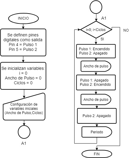 Para generar los pulsos para validar el circuito propuesto, se implementó un programa usando Arduino Uno. El Arduino fue programado para generar pulsos complementarios (DAC1 y DAC2) con frecuencia y ancho de pulso variable. El diagrama de flujo en la Figura 2 describe cómo funciona el programa.