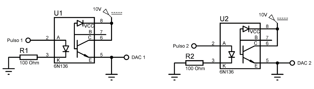 Cada pulso (DAC1 y DAC2) se genera utilizando las salidas digitales del Arduino. Sin embargo, como DAC1 y DAC2 deben ser señales de voltaje de amplitud variable, para controlar la magnitud de la corriente, las salidas del Arduino se conectaron a un circuito auxiliar compuesto por un divisor de voltaje y un amplificador operacional en la configuración de seguidor de voltaje. Este circuito hizo posible controlar la magnitud del voltaje de DAC1 y DAC2 de 0 a 10 volts. La Figura 3 muestra este circuito auxiliar. Además, para proteger al circuito propuesto, se realizó un circuito de aislamiento hecho por optoacopladores.