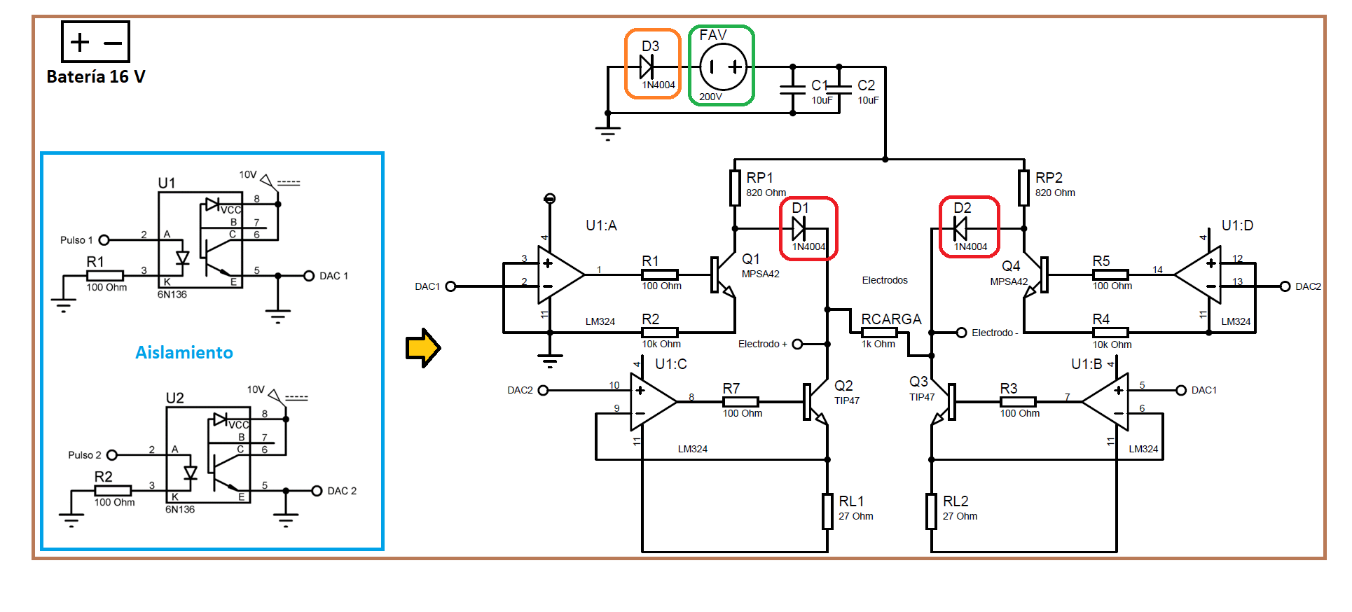 Se definieron 4 elementos electrónicos, los cuales brindan seguridad eléctrica a la etapa de potencia, y principalmente al usuario (ver Figura 6). El primero de estos elementos es un optoacoplador 6N136 de alta velocidad de respuesta con un aislamiento de 5300 Vrms, el cual se encuentra en la etapa de aislamiento (área delimitada de color azul), esta recibe las señales de control generadas de la tarjeta de desarrollo Arduino, permitiendo la comunicación entre la etapa de control y la etapa de potencia, este elemento brinda seguridad eléctrica a ambas etapas. El segundo elemento, es una fuente de alto voltaje aislada (FAV - 12QP200), con un aislamiento de 2500 Vrms, con este elemento se brinda seguridad eléctrica al usuario y a la etapa de potencia (área delimitada de color verde). El tercero, con el fin de evitar corrientes de retorno se colocaron diodos rectificadores (1N4004) a la salida de cada rama del puente H, estos diodos brindan seguridad a la etapa de potencia (sección delimitada de color rojo). Como elemento final de protección, se colocó un diodo rectificador (1N4004) a la tierra de la FAV para evitar el acoplamiento de ruido conductivo entre las fuentes de alimentación del sistema y evitar en cierto escenario la aplicación de una corriente de estimulación desconocida (área delimitada de color naranja). Adicionalmente, a estos circuitos de seguridad, el diseño permite que todo el circuito sea alimentado por baterías (área delimitada de color café) lo que provee un aislamiento tipo F a la etapa de potencia. Teniendo esto en cuenta se consideró que, para prevenir cualquier situación de riesgo, como un corto circuito por conectar las baterías con la polaridad invertida, también se planea integrar en el prototipo físico, otro elemento de seguridad, como lo es, un circuito de protección para prevenir conexiones de baterías con polaridad invertida.