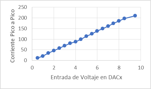 Como se puede observar, la corriente dependerá únicamente de los voltajes aplicados a DAC1 y DAC2 y una resistencia constante, a pesar de que existan cambios en la impedancia de la piel.