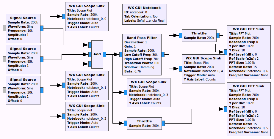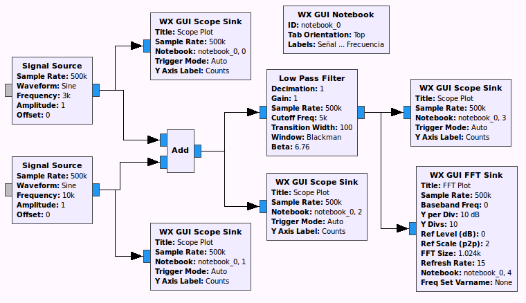 Interfaz gráfica en GNU Radio con todos sus componentes.