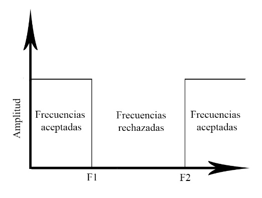 Como se puede apreciar en la figura 13, la forma en que actúa un filtro rechaza banda, dejando pasar solo aquellas frecuencias por debajo de F1 y encima de F2, rechazando todas aquellas fuera de estos rangos.