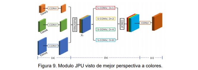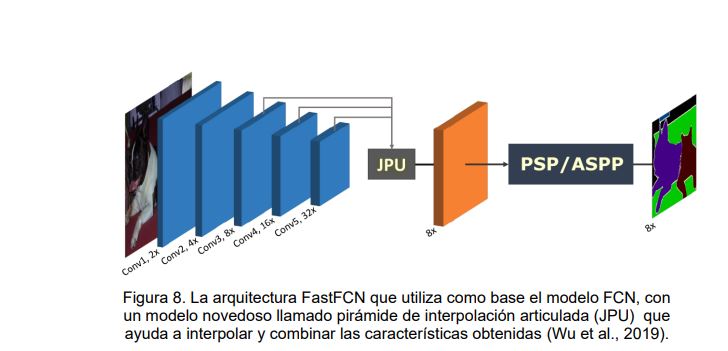 Finalmente, (Wu, Zhang, Huang, Liang, & Yu, 2019) presentaron la red totalmente convolucional rápida (FastFCN por sus siglas en inglés), y se trata de una arquitectura para SS que parte del modelo FCN la cual se muestra en la Figura 8. Utiliza convoluciones dilatadas en su estructura principal para extraer mapas de características de alta resolución. Para evitar una complejidad computacional pesada y una huella de memoria grande, se propone un módulo para descomprimir los mapas de características llamado pirámide de muestreo ascendente conjunta (JPU por sus siglas en ingles). Este módulo tiene como objetivo para una imagen de entrada baja resolución y un groundtruth de alta resolución generar una salida de alta resolución mediante la transferencia de detalles y estructuras de la imagen de entrada. Generalmente, el groundtruth de baja resolución Z1 es generada empleando la transformación F(X) en la imagen de baja resolución de entrada Xl, por ejemplo, Zl = f(Xl). Teniendo Xl y Zl es necesario obtener la transformación F̂(X) para aproximar F(X), donde la complejidad computacional de F̂(X) es menor que F(X). Por ejemplo, si F(X) es un perceptrón multi capa (MLP), entonces F̂(. ) puede ser simplificada como una transformación lineal. La imagen grountruth de alta resolución yh es obtenida aplicando la transformación F̂(. ) en la imagen de alta resolución de entrada Xh de la forma 𝑍ℎ = F̂(𝑋ℎ ) formalmente dadas Xl, Zl y Xh el muestreo ascendente conjunto es definido como:
