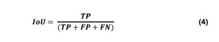 donde TP, FP y FN son la cantidad de pixeles de verdadero positivo, falso positivo, y falso negativo respectivamente. La Tabla 1. muestra los resultados y comparación en tiempo de inferencia, promedio de precisión y huella de memoria en la base de datos Cityscapes. Respecto a los campos de la Tabla 1.