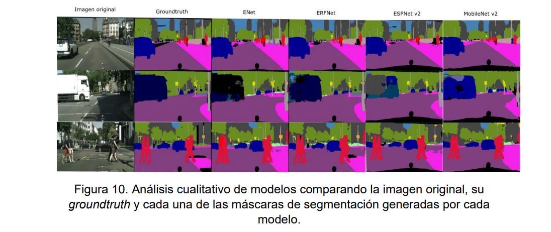 Un análisis cualitativo de los modelos seleccionados se muestra en la Figura 10. donde se ven reflejados las puntuaciones de precisión alcanzados por cada modelo, de izquierda a derecha se puede observar la imagen de entrada seguida de la imagen objetivo o groundtruth, posteriormente los resultados de Enet, ERFNet, ESPNet v2 y MobileNet v2 donde es posible destacar en cada imagen la forma en que se segmentan objetos distintos de interés, en la primera imagen observamos como MobileNet v2 tiene un resultado mas limpio aunque omite el fondo negro ubicado en la esquina superior izquierda que se encuentra en el groundtruth, por otro lado en la segunda imagen es ERFNet el que logra segmentar con una mayor precisión el objeto que le cuesta mas al resto de modelos, que en este caso es el camión blanco que pasa por delante de la camara.