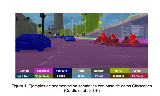 En la actualidad, existen una gran cantidad de arquitecturas de CNNs aplicadas a segmentación semántica (SS) que asignan una etiqueta l de un conjunto comprendido por ℒ = { 𝑙1,𝑙2, … , 𝑙𝑛} para cada elemento del conjunto de variables aleatorias de entrada 𝑋 = {𝑥1, 𝑥2, … , 𝑥𝑁}. Cada etiqueta l representa una clase u objeto con significado semántico diferente como avión, vehículo, señal de tráfico o fondo. Por otro lado, la variable X es una imagen de una secuencia de video. A menudo se etiquetan las clases con máscaras de color para visualizarlas en las imágenes, como se puede observar en la Figura 1.