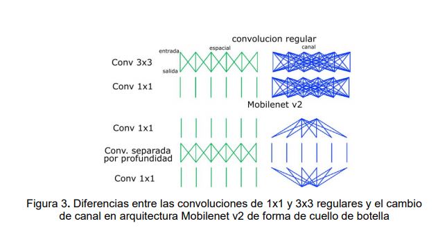 Finalmente, se realiza otra convolución de 1x1 para reducir la dimensión del canal construyendo nuevas características al calcular combinaciones lineales de los canales de entrada. En la Figura 3. se aprecia este modelo de cuello de botella. La arquitectura de Mobilenet v2 contiene inicialmente una capa convolucional con 32 filtros, seguidos de 19 capas de cuello de botella previamente descritos.