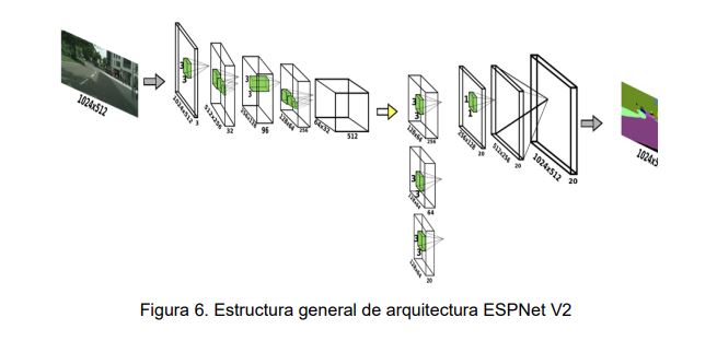 Por otro lado, en (Mehta, Rastegari, Shapiro, et al., 2018) se presentó una segunda versión de la red de pirámide espacial eficiente de convoluciones dilatadas (ESPNet por sus siglas en ingles), una red eficiente en términos de procesamiento, memoria y potencia. Esta arquitectura se muestra en la Figura 6. el bloque principal de construcción es un bloque convolucional nuevo llamado pirámide espacial eficiente (ESP por sus siglas en inglés) y se basa en descomponer una convolución estándar en dos pasos: