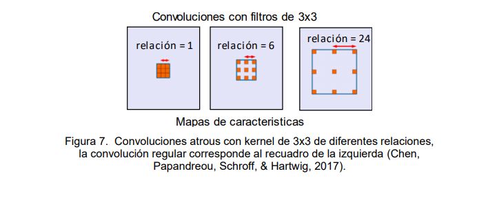 2. Pirámide de convolución dilatada espacial. Es un mecanismo similar al de ASPP que aprovecha las convoluciones atrous mostradas en la Figura 7. Pero en este caso, es menos costoso computacionalmente debido al acomodo en forma de pirámide, ya que el módulo ASPP utiliza una serie de convoluciones dilatadas sin orden jerárquico y tiene la capacidad de usar diferentes niveles espaciales para aprender representaciones.