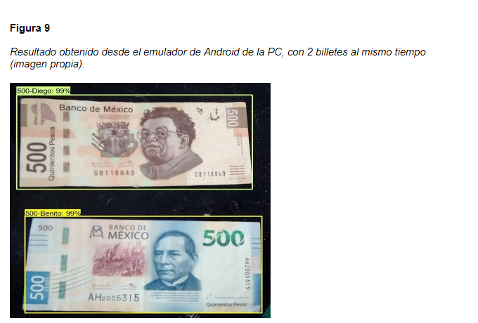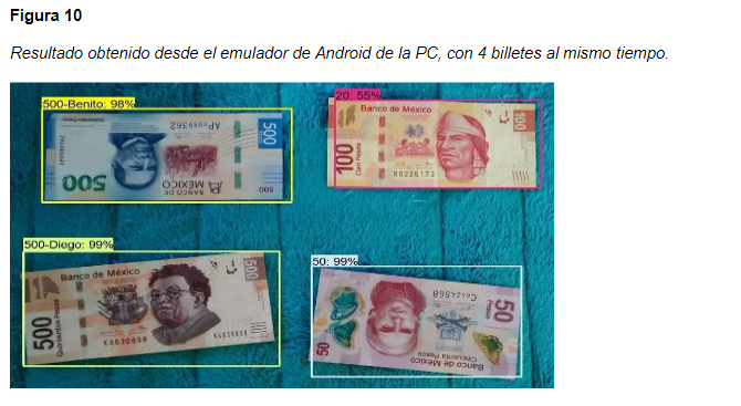 Dicho esto, es muy probable que en versiones futuras de Tensorflow Lite el modelo pueda otorgar resultados satisfactorios. Mientras tanto, se logró un excelente progreso en el modelo de Tensorflow, lo que puede servir para otro tipo de aplicaciones en entornos no móviles que requieran la detección confiable de billetes mexicanos y sus correspondientes denominaciones.