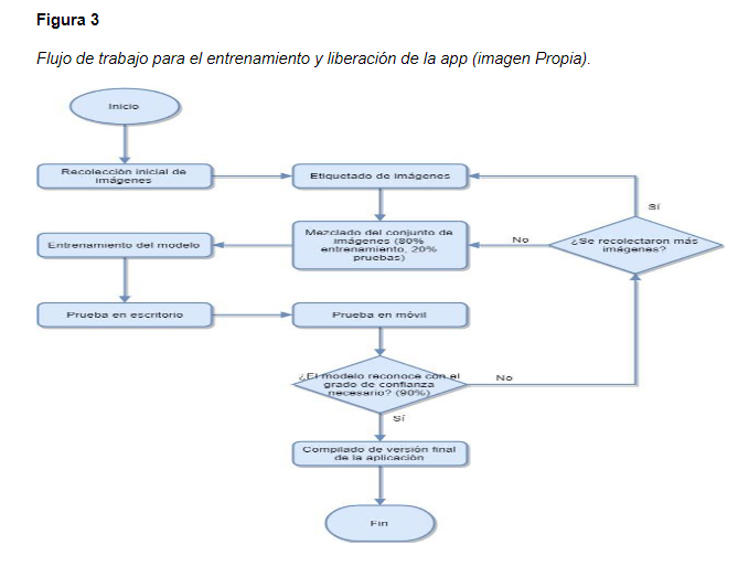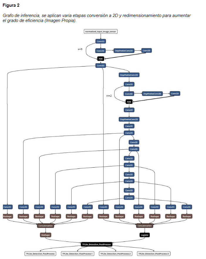La red neuronal recibe como entrada la imagen redimensionada a 300 pixeles de ancho por 300 pixeles de alto. Como salida, la red neuronal proporciona cuatro tensores que contienen las ubicaciones de las cajas de las detecciones, las clases de las detecciones, el grado de confianza de las detecciones, y el número de detecciones (ver figura 2, grafo de inferencia y red neural). A partir de estos resultados, escalar las dimensiones de las cajas y traducir las clases a los tipos de billetes detectados para dibujar sobre la imagen original es una tarea trivial. Una vez definido el modelo y sus parámetros, se estableció el flujo de trabajo de acuerdo al diagrama de la figura 3. El desarrollo siguió un patrón iterativo basado en el entrenamiento del modelo.