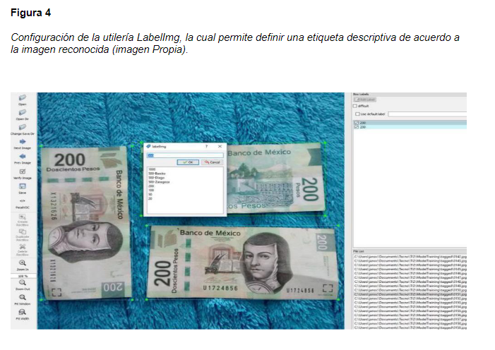 Después de recolectar imágenes, la siguiente tarea es el etiquetado de las mismas. Con ayuda de un software de etiquetado como LabelImg se dibujan rectángulos sobre cada billete presente en una imagen y se les asigna una etiqueta correspondiente al nombre de la clase (ver figura 4, etiquetado de las imágenes). Una vez que todas las imágenes se han etiquetado procede con la siguiente etapa.