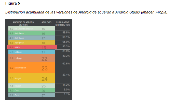 La aplicación fue desarrollada para el sistema operativo Android. Como requisito mínimo se estableció la versión 4.4 (Kitkat) del mismo para cubrir el 95.3% de los dispositivos activos al mes de noviembre de 2018 (ver figura 5, distribución acumulada de versiones de Android) de acuerdo con la información proporcionada por Android Studio en su versión 3.2.1, entorno de desarrollo utilizado para la presente investigación. La única dependencia de la aplicación es Tensorflow Lite en su versión 1.10.0.
