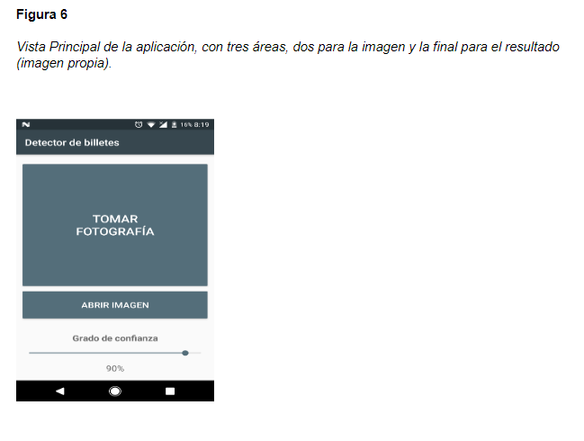 La aplicación es muy básica, con 2 vistas o actividades diferentes. La primera permite seleccionar entre tomar una fotografía con una aplicación de cámara ya existente en el dispositivo móvil o seleccionar una imagen de la galería, además de permitir ajustar el grado de confianza mínimo aceptable para las detecciones (ver figura 6, vista principal de la aplicación).