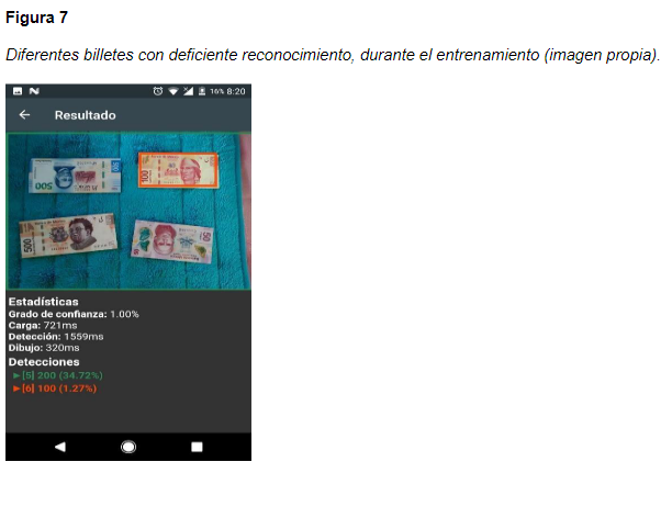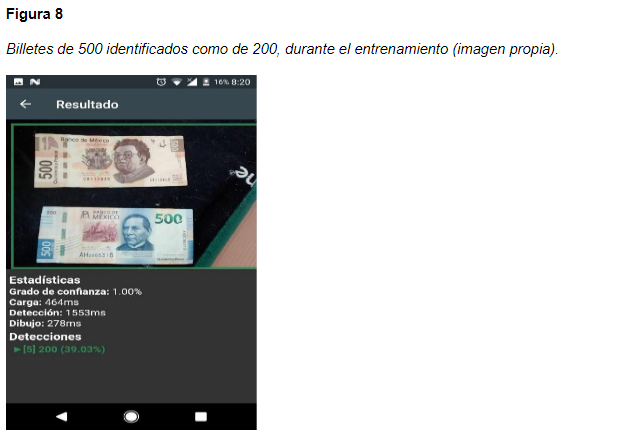 Como se puede observar en las figuras 7 y 8, el modelo detecta un billete de doscientos pesos del tamaño de toda la imagen en lugar del resultado esperado (ver figuras 9 y 10), situación que se presentó a lo largo de las 10 pruebas individuales realizadas. En algunos casos, como se puede observar en la figura 7, es detectado alguno de los billetes de manera correcta, con un grado de confianza bastante bajo, como consecuencia, si éste es aumentado a un 90% (configuración óptima) la aplicación no sería capaz de detecciones aceptables.