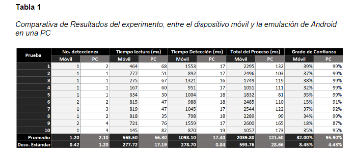 La aplicación móvil alimentó las imágenes exitosamente al modelo de Tensorflow Lite. Los resultados de las 10 pruebas se muestran en la tabla 1, comparados con los obtenidos de las mismas imágenes en la versión de escritorio. En la tabla se pueden observar tres cosas importantes. Primeramente, el tiempo de procesamiento es en promedio dieciséis veces mayor para la aplicación móvil. La segunda situación observable es que para la aplicación de escritorio la confiabilidad promedio es de 95%, la versión móvil apenas alcanza un 32% lo cual es considerablemente bajo y nada satisfactorio. Por último se denota que la cantidad de billetes detectados no pasa de dos en la versión móvil, cuando se deberían de detectar hasta cuatro en algunas situaciones, como es el caso de las pruebas 9 y 10. Cabe destacar que la desviación estándar nos indica que los datos estadísticos de la versión móvil no son estables.
