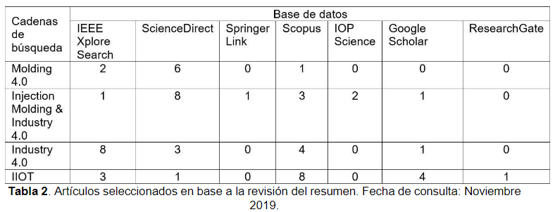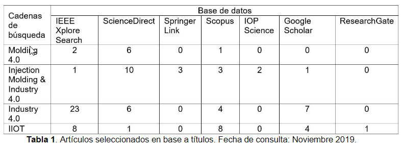 Dado que se busca encontrar la evidencia de casos lo más actuales posibles, una cantidad importante de esta indica que se están evaluando prototipos o nuevas propuestas de cómo abordar problemáticas. En este sentido los resultados aún no son muy claros, sin embargo, las propuestas de solución implementando estas nuevas herramientas son de interés para la perspectiva de evolución de tecnologías de Industria 4.0. Por lo anterior, este tipo de información documentada se puede encontrar en bases de datos o fuentes de información de menos peso pero que proporcionan un mayor volumen de resultados y acceso a los mismos, como son Google Scholar o ResearchGate. Su uso es como fuente de información auxiliar, puesto que en estas bases de datos se pueden encontrar estudios realizándose actualmente, avances de implementaciones, prototipos o revisiones de propuestas antes implementadas con nuevos enfoques. Es por lo que, si bien sirven para darnos una guía, se tiene que evaluar un tanto más a fondo las referencias o alcance de los estudios que están reportando dichos resultados.