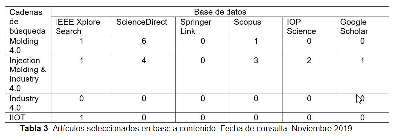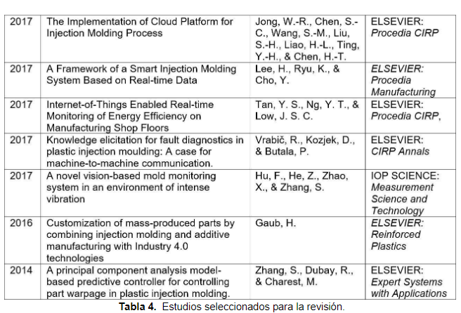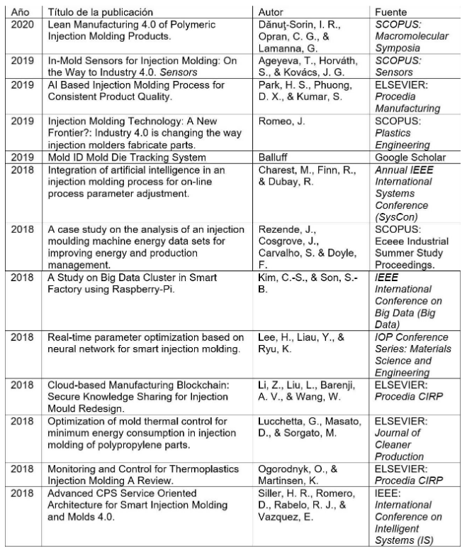 Siguiendo el diagrama de flujo en la figura 6, de los documentos de interés por contenido se seleccionaron los estudios donde se implementaron tecnologías de industria 4.0 o IIoT para la industria de moldeo por inyección de plástico. Estos se clasificaron cronológicamente para observar más de cerca la evolución que ha tenido la implementación de dichas tecnologías a lo largo del tiempo, así como las diferentes maneras de poder abordar la problemática que se plantea en cada caso de estudio. Los estudios seleccionados se muestran en la tabla 4, incluyendo la fuente de la que fueron obtenidos.