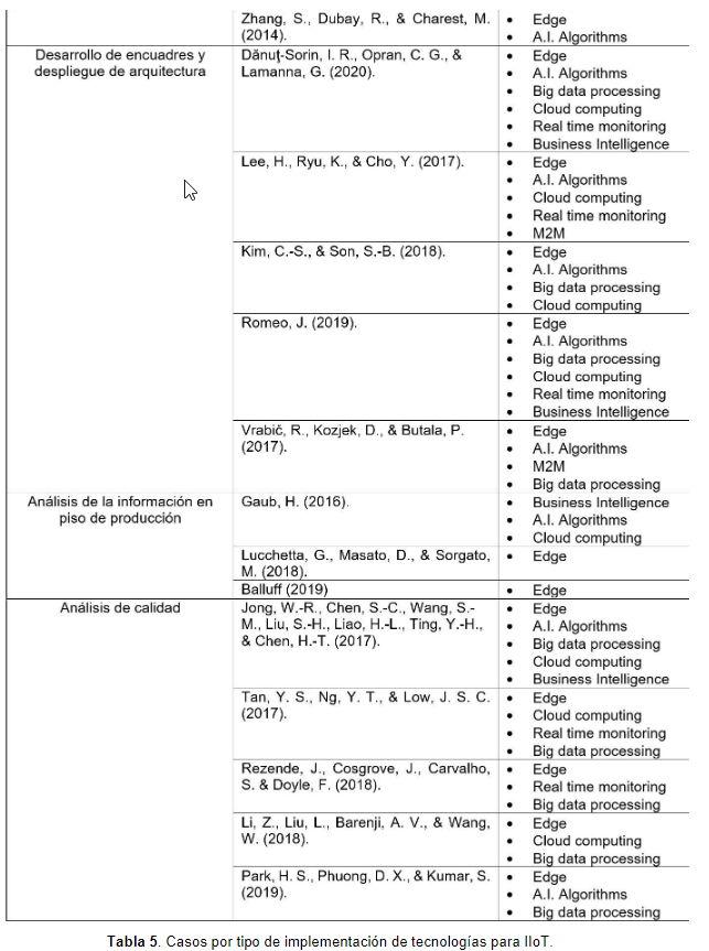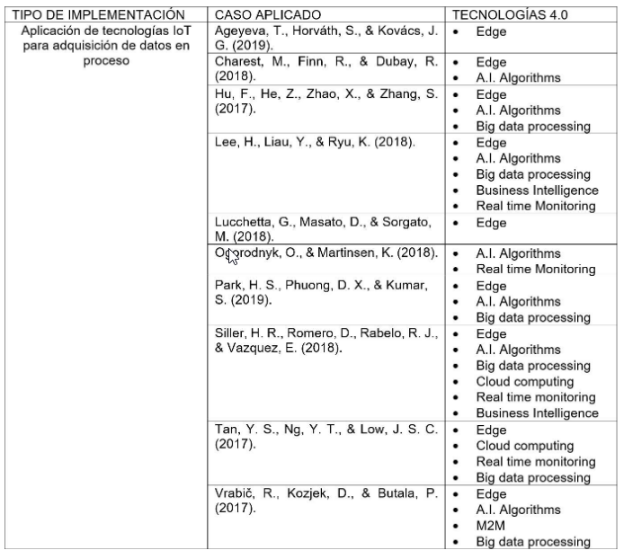 En la tabla 5 se presentan los casos para cada tipo de implementación encontrada, se observa que mayormente esta tecnología está siendo aplicada para la adquisición de datos dentro de los procesos. Además, para cada caso se menciona el segmento de tecnologías que fueron utilizadas en la implementación.