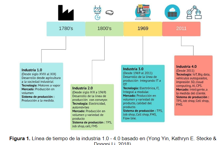 Como precursora de la revolución industrial se puede considerar a la transición de una cultura nómada a una sedentaria, gracias al establecimiento de un sistema de producción local de alimentos a partir de la agricultura. Esto trajo como consecuencia la necesidad de crear sistemas de transporte, comunicación y modelos económicos entre las diferentes regiones, así como un incremento en la población de estas. A esta etapa siguieron cambios paulatinos hasta llegar a lo que actualmente conocemos como revoluciones industriales, cuyas características más evidentes se muestran en la figura 1 y se describen a continuación (ACATECH, 2013), (Klaus Schwabm, 2016):