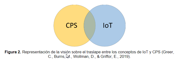 Los conceptos de IoT y CPS tienen puntos en común que hacen que en ocasiones sean utilizadas de forma indistinta, o llevan a representaciones como la que se observa en el diagrama de Venn de la figura 2. Estos traslapes se deben a las capacidades que conllevan conectar el mundo real al que en definición de CPS se toma como la “entidad física o sistemas de ingeniería” o por sus siglas en inglés “Physical”, mientras que en la definición de IoT se toma como “Cosa” o por su sigla en inglés “Thing”. Sin embargo, en este último se denomina como “cosa” también a las entidades virtuales, ya que su objetivo es relacionar lo físico con lo digital, otorgándole una etiqueta a este ente físico.