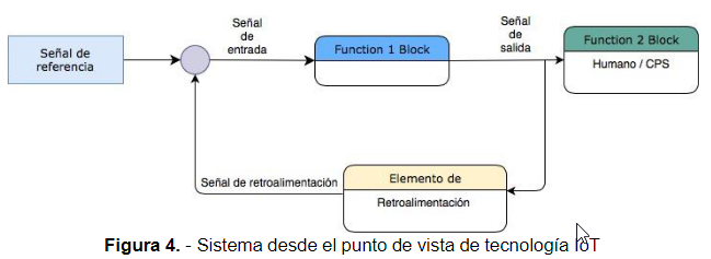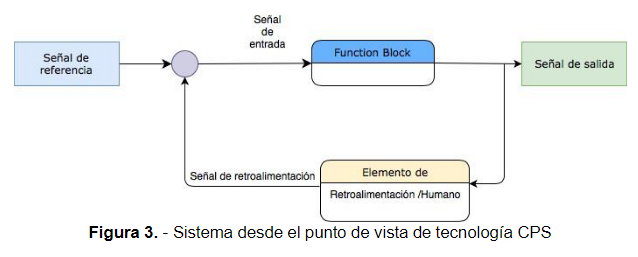 Ambos puntos de vista tratan de relacionar el mundo físico con el digital a través de sensores y tecnología interactiva. Sin embargo, la diferencia puede encontrarse en la perspectiva que cada uno le da a sus componentes. El CPS se entiende como un sistema que toma como prioridad el intercambio y retroalimentación de información para el sensado y control de actuadores del mundo físico, buscando establecer un sistema de ciclo cerrado y tomando a la persona como un factor necesario que interactúa con el sistema, lo cual se observa en el diagrama a bloques de la figura 3.